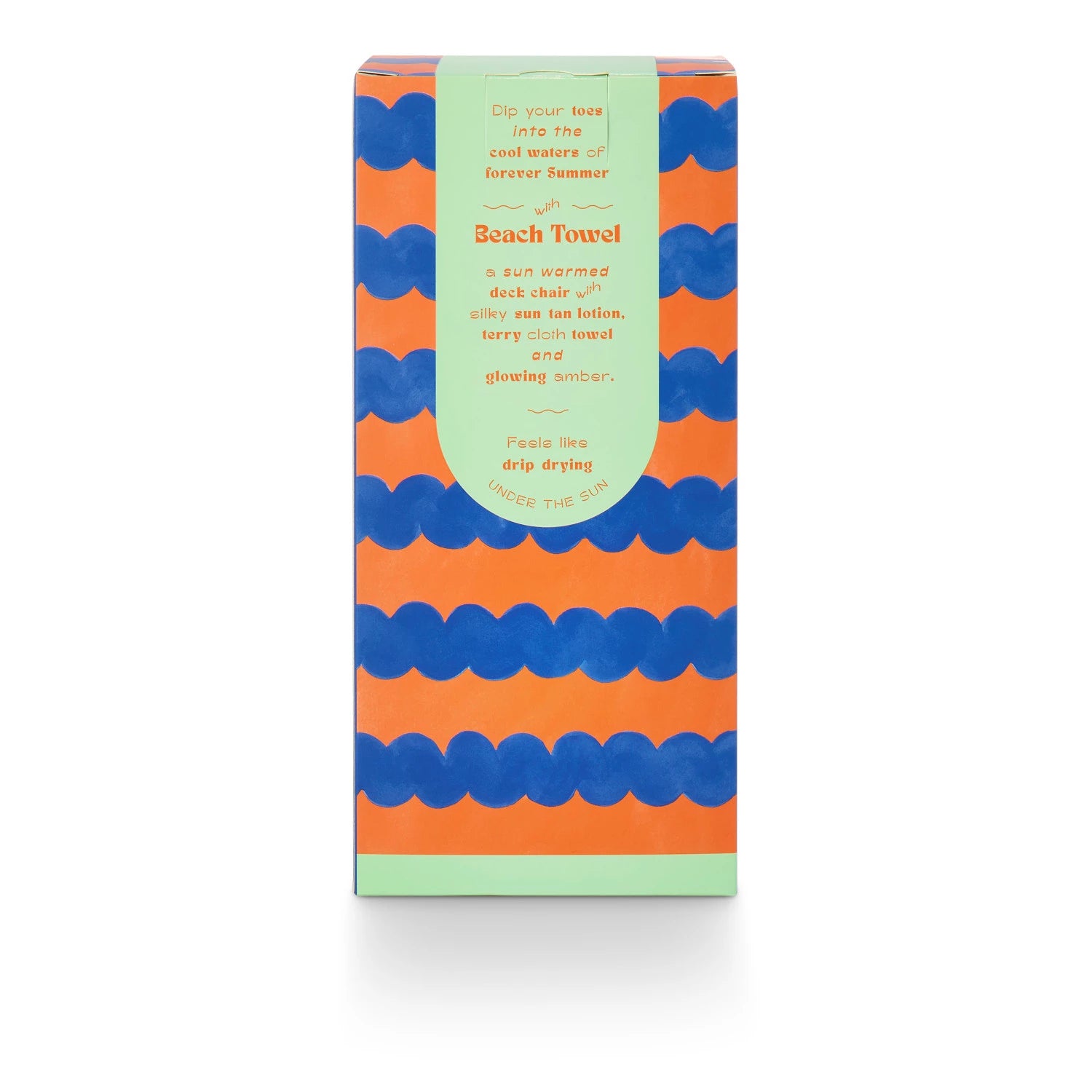 Transport yourself to the shore with the Beach Towel Aromatic Sun Diffuser. This clean, summery scent is inspired by a sun-drenched afternoon, blending notes of silky suntan lotion, fresh terry cloth towel, and comforting glowing amber. The unique blue, stacked-ring glass bottle and vibrant, patterned packaging bring a playful, retro-cool aesthetic to your home. Plus, the formula is vegan and cruelty-free.