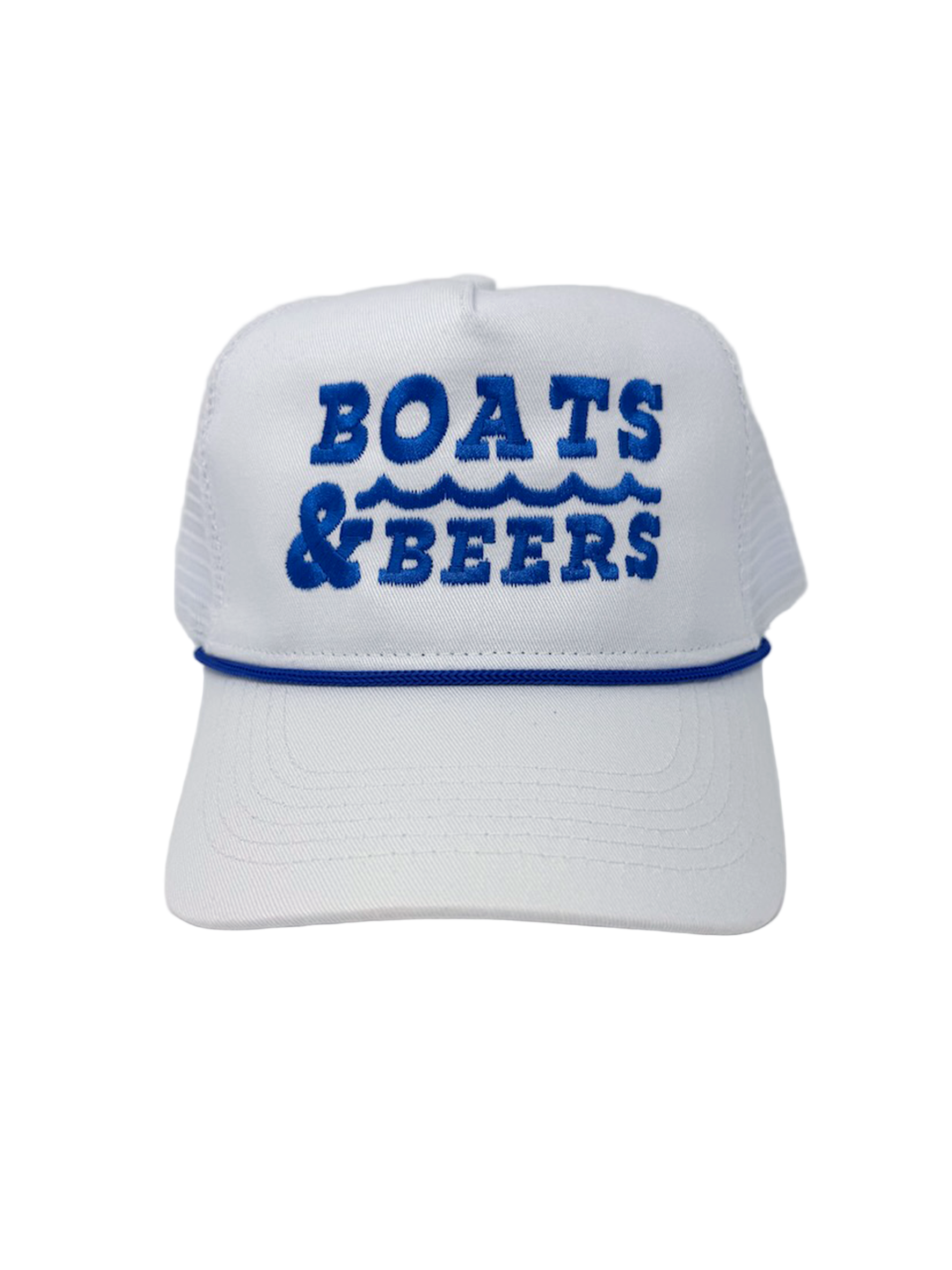 The hat features the fun, nautical-inspired phrase "BOATS & BEERS" embroidered on the front in a bright, eye-catching blue. Designed in the classic trucker style, it includes a breathable mesh back to keep you cool, and a blue and white rope across the bill for a touch of retro charm. With an adjustable snapback closure, this hat ensures a comfortable fit for any captain or deck hand ready to relax on the open water.