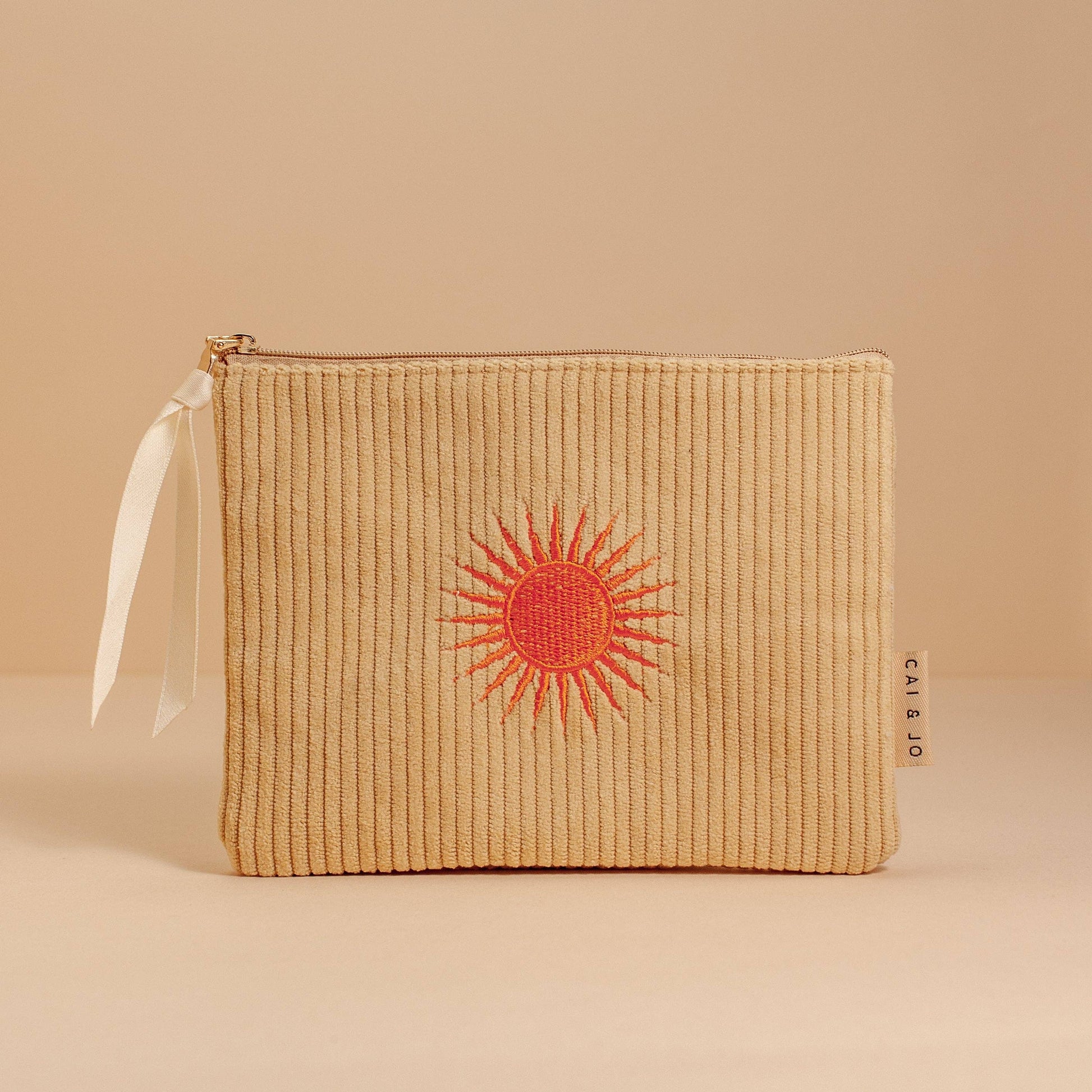 Keep your essentials shining with this sun-embroidered cosmetic bag. Made from soft, textured fabric with a warm, earthy tone, it’s perfect for storing makeup, travel must-haves, or beach-day bits. Lightweight, stylish, and effortlessly coastal — your go-to pouch for sunny days and getaways.