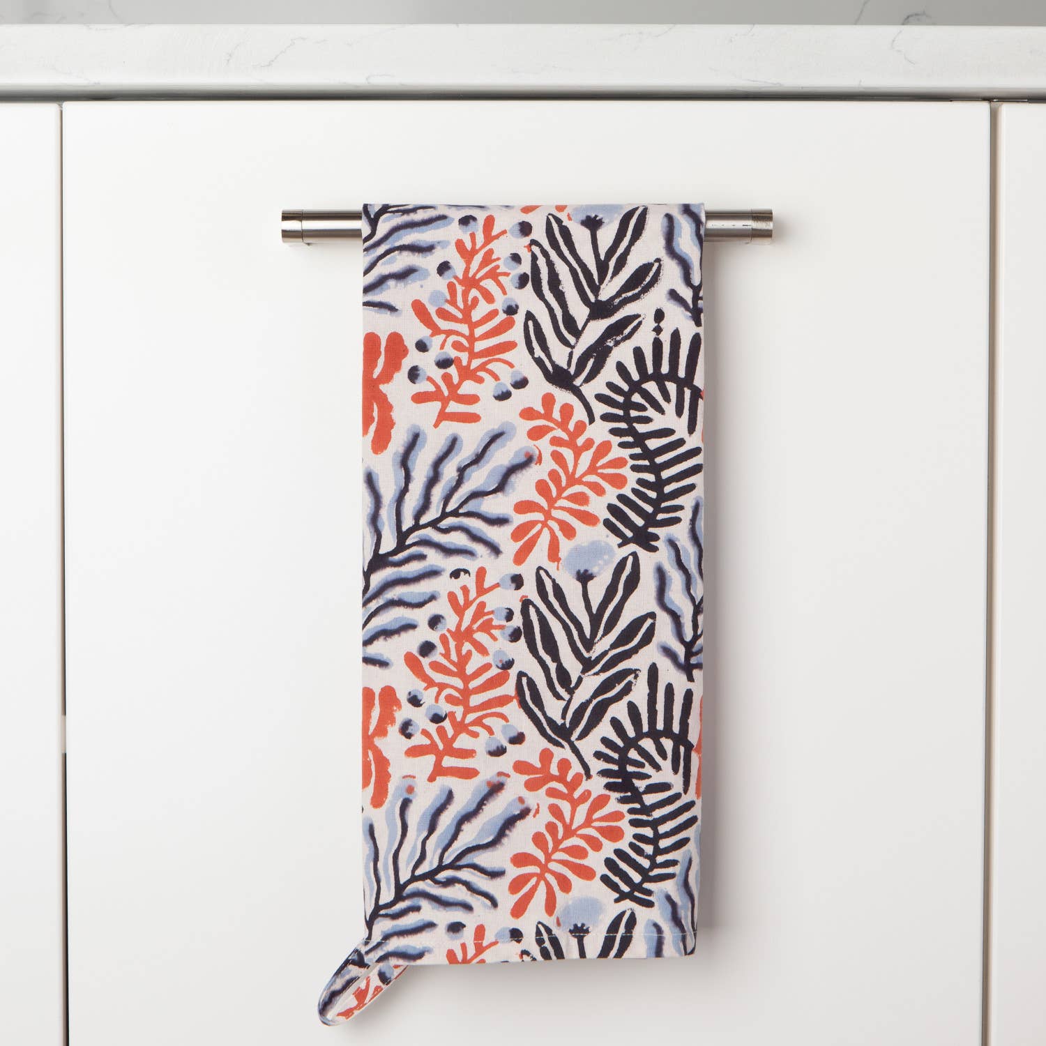 Soothing shapes ebb, flow and embrace in waves of abstract vines and blossoms across this Entwine Block Print Dishtowel by Danica Studio. Custom designs come to life with cotton dishtowels meticulously block printed with artisan details from geometric patterns to foliage-inspired motifs. Every space can use a glow up courtesy of everyday linens that hold extraordinary appeal.