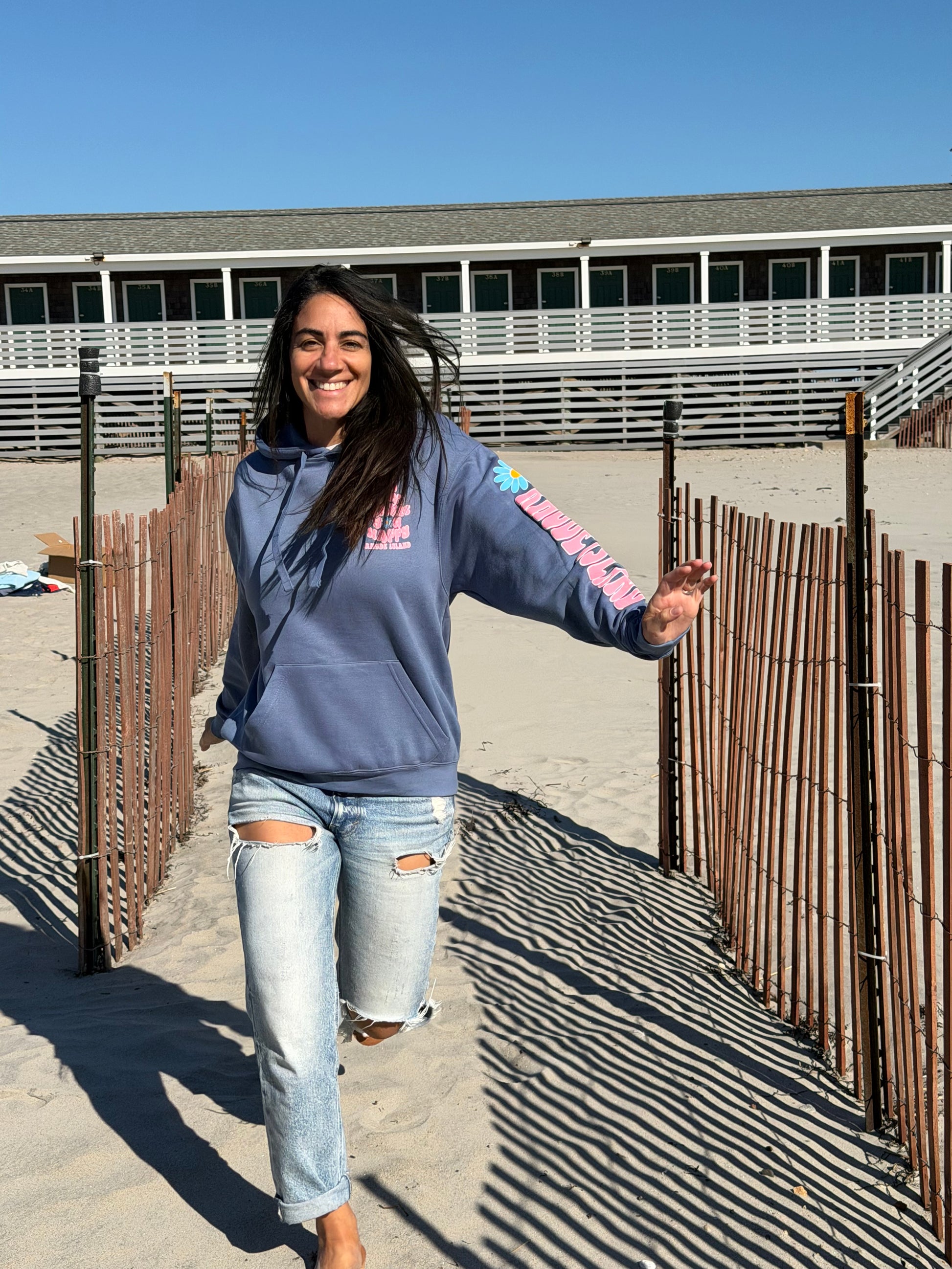This cheerful blue hoodie is designed to spread good vibes wherever you go. Featuring the uplifting slogan ‘Do What Makes You Happy’ and a subtle Rhode Island touch at the bottom, it’s the perfect blend of comfort and coastal charm