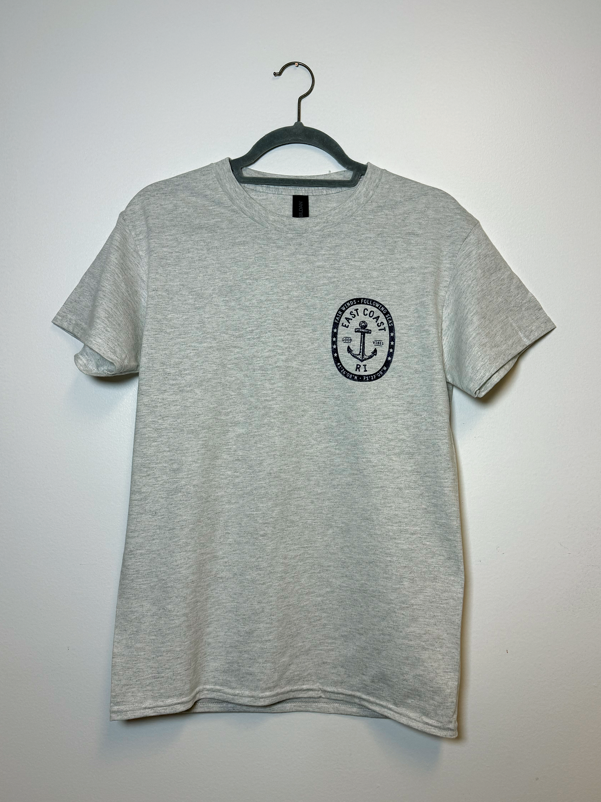 This comfortable grey heather tee features a striking distressed circular graphic on the back in a deep navy blue. The vintage-inspired design centers on a classic anchor and reads "EAST COAST" above it and "GOOD VIBES" on either side. Encircling the design are the nautical phrases "FAIR WINDS" and "FOLLOWING SEAS," along with the geographical coordinates 41°26'08" N 71°27'08" W and the state abbreviation RI, proudly representing Rhode Island. Made from a soft, easy-to-wear fabric, this shirt is perfect for anyone who loves boating, the beach, or just that laid-back East Coast lifestyle. It's an instant favorite for casual days!
