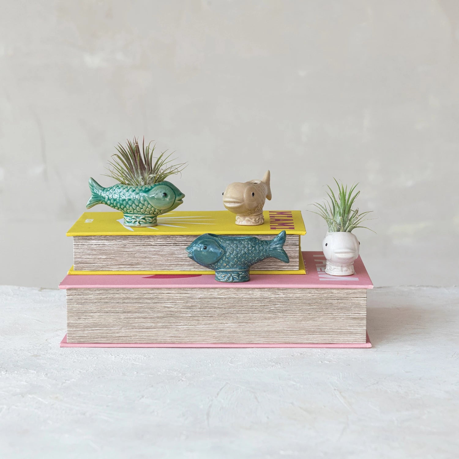 Bring a wave of seashore style to your home with a ceramic fish holder. (Sold individually) Finished in rich glazes (taupe, sage, off-white, and blue) with a detailed scale texture, these versatile pieces are perfect as unique toothpick holders for your dining table or as charming mini planters for succulents and air plants.