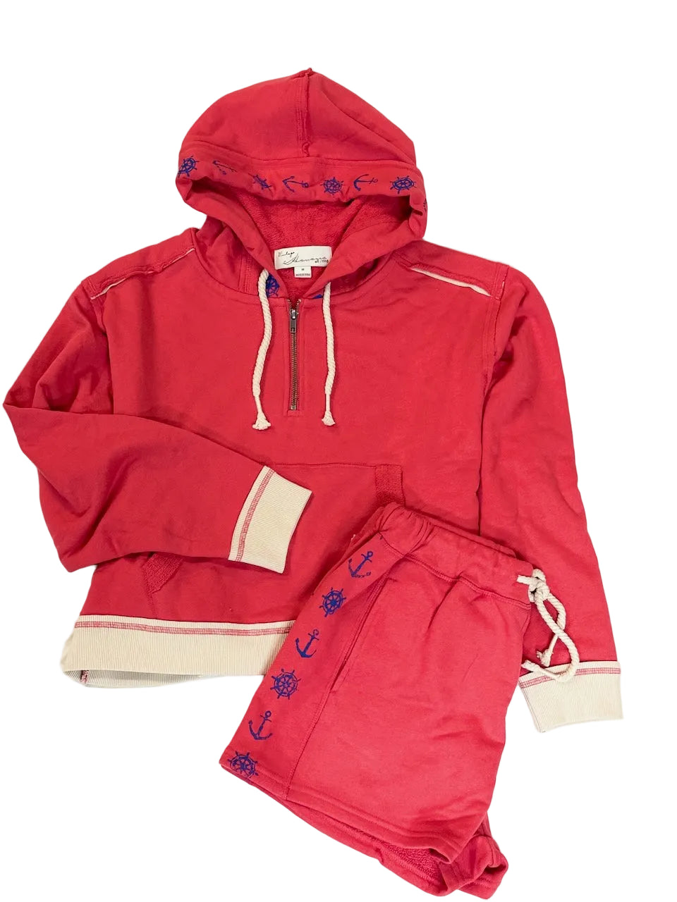 Stay comfortable and stylish with these vibrant red shorts, featuring a nautical anchor and ship wheel pattern along the sides for a classic maritime touch. They are designed with a functional rope drawstring and an elastic waistband to ensure a perfect, adjustable fit for any beach day. Whether you're lounging poolside or heading to the boardwalk, these soft jersey shorts are the ultimate essential for your spring break wardrobe.