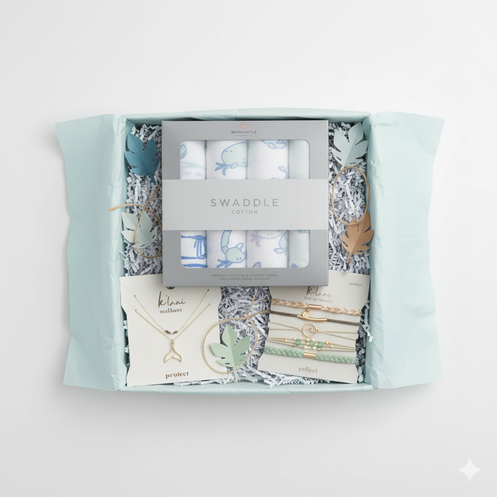 Celebrate the bond between mother and child with our Mommy & Baby Gift Set. This sweet bundle includes four soft baby swaddles, a delicate “Protect” necklace, and a matching “Reflect” bracelet — thoughtful pieces to wrap baby in comfort and honor the love and cherished moments between mom and little one.