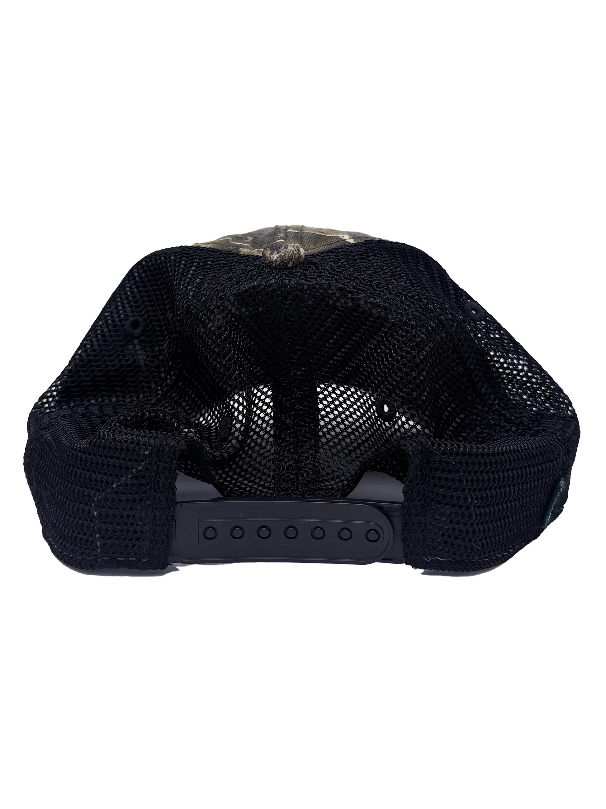 This mesh snapback trucker hat features a camouflage print and a leather Rhode Island patch detailed with crossed fish hooks—a perfect blend of rugged style and coastal pride.