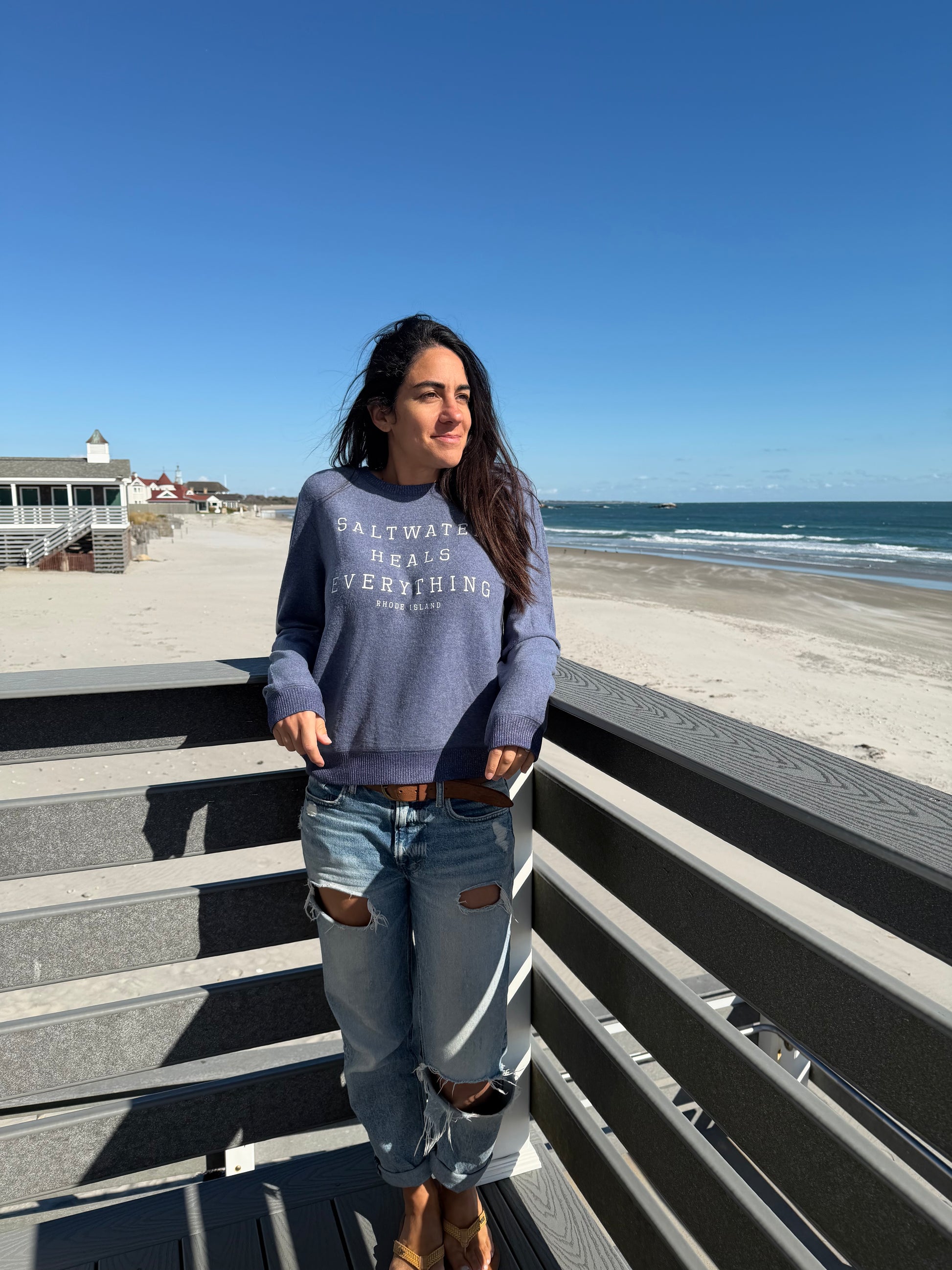 Easy, breezy, and made for salty days by the shore. This lightweight ocean blue sweater features our Saltwater Heals Everything graphic across the front and has that perfectly relaxed fit you’ll reach for again and again. Pair it with the matching joggers for the full laid-back coastal look — ideal for morning coffee runs, beach walks, or sunset lounging.