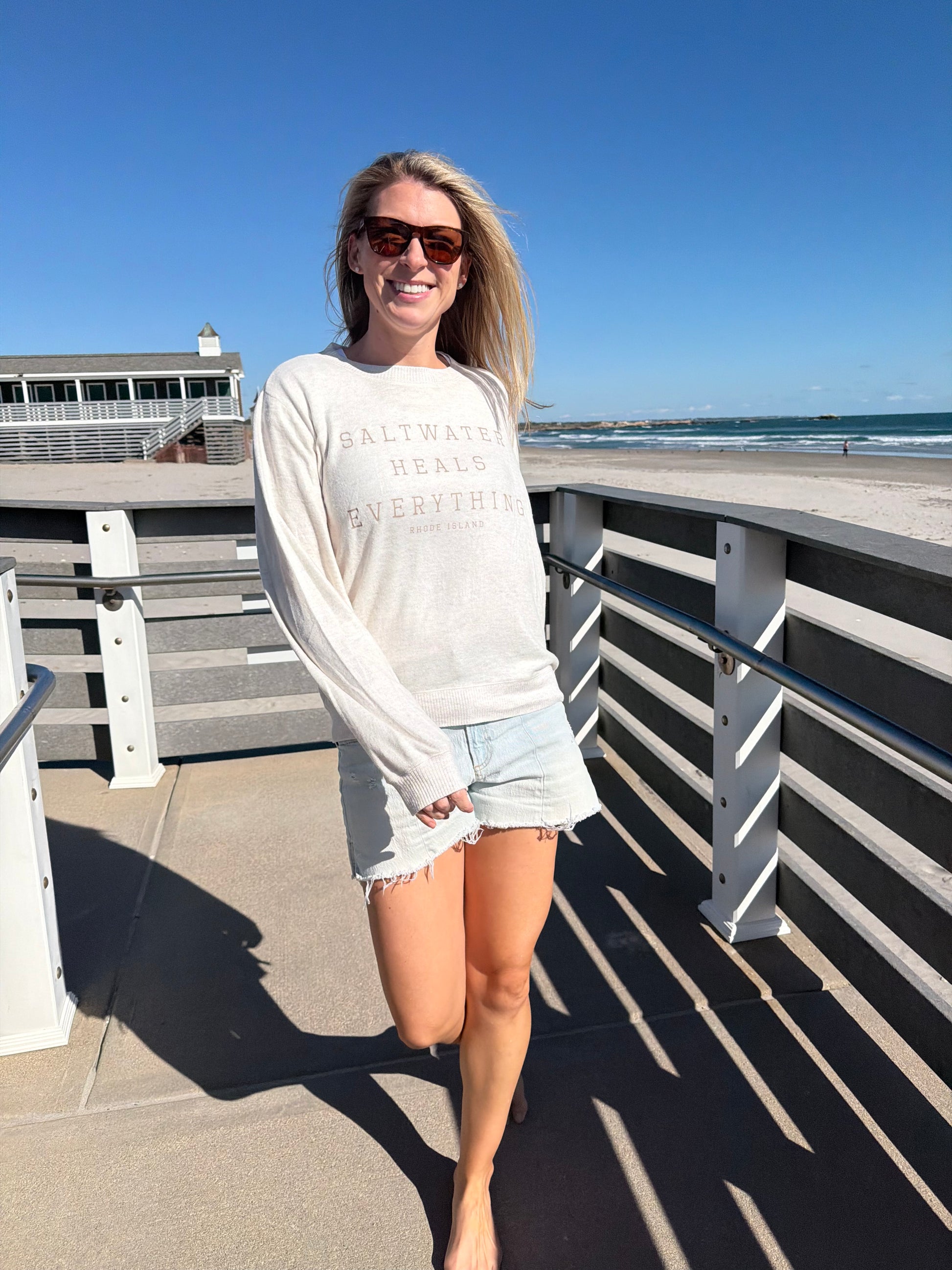 Our Saltwater Heals Everything sweater captures that effortless coastal energy, with a soft, breathable hacci fabric that’s made for beach walks and sunset hangs.