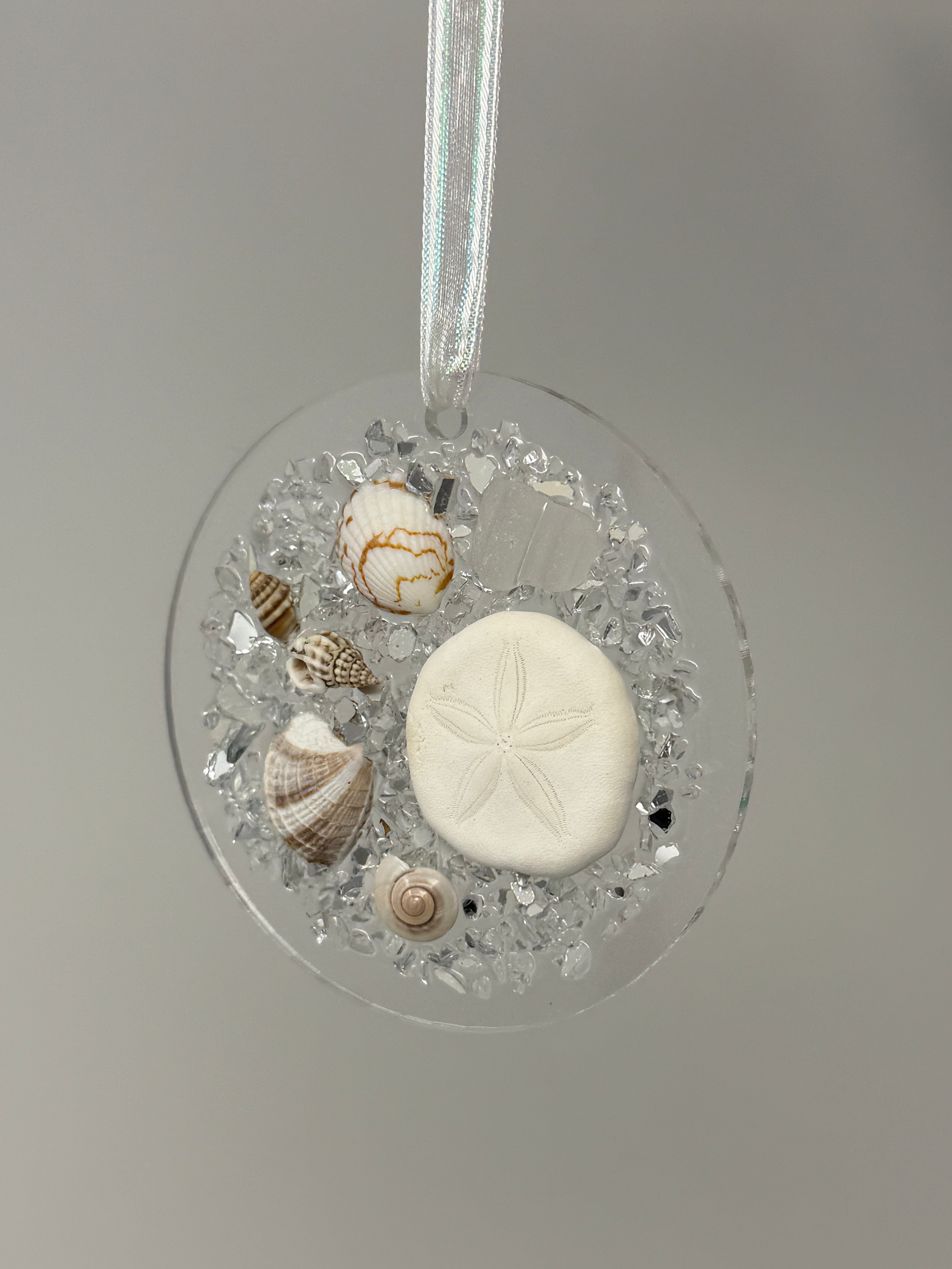 Bring a touch of the coast to your Christmas tree with this beautiful sand dollar ornament, accented with tiny seashells and shimmering silver flakes. A seaside-inspired decoration that keeps beachy vibes alive all winter long.
