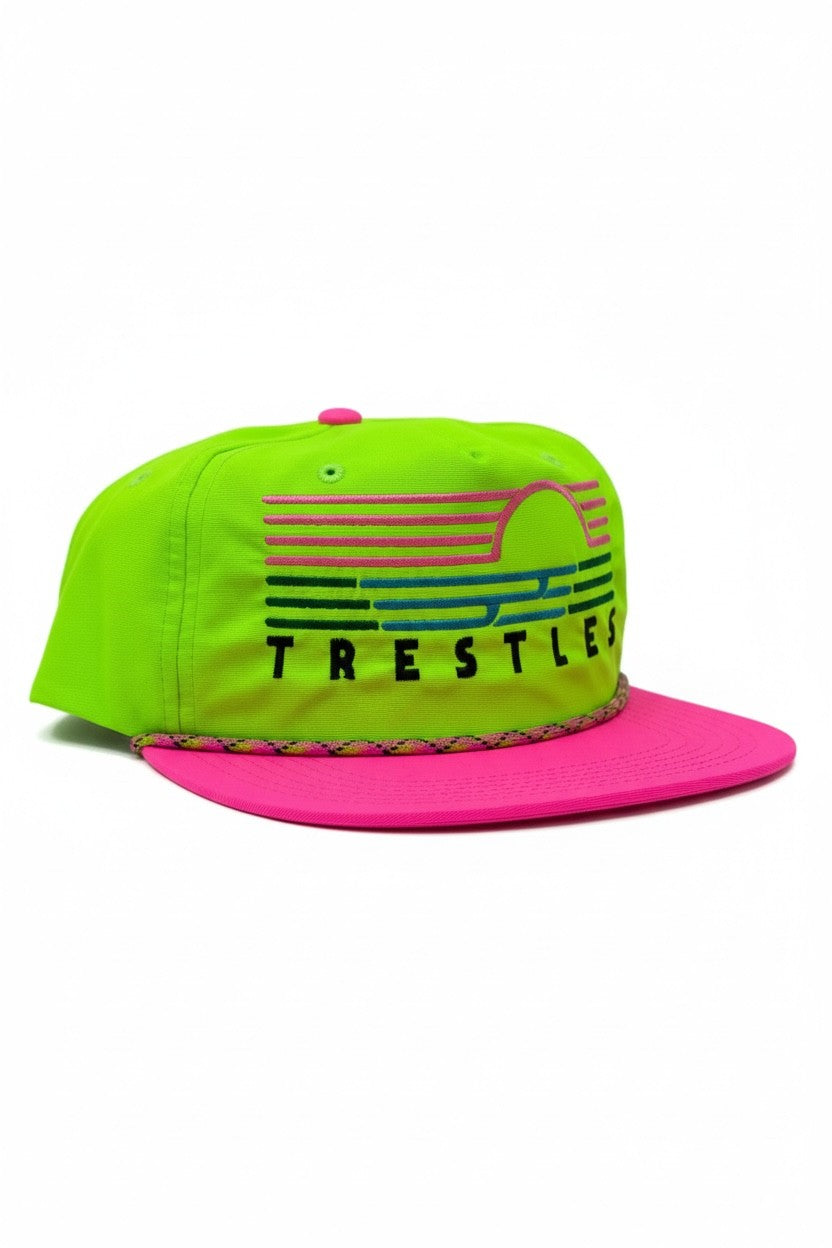 Turn up the stoke. This neon Trestles hat brings retro surf energy with a bold wave graphic and classic rope detail. Lightweight, bright, and built for beach days.