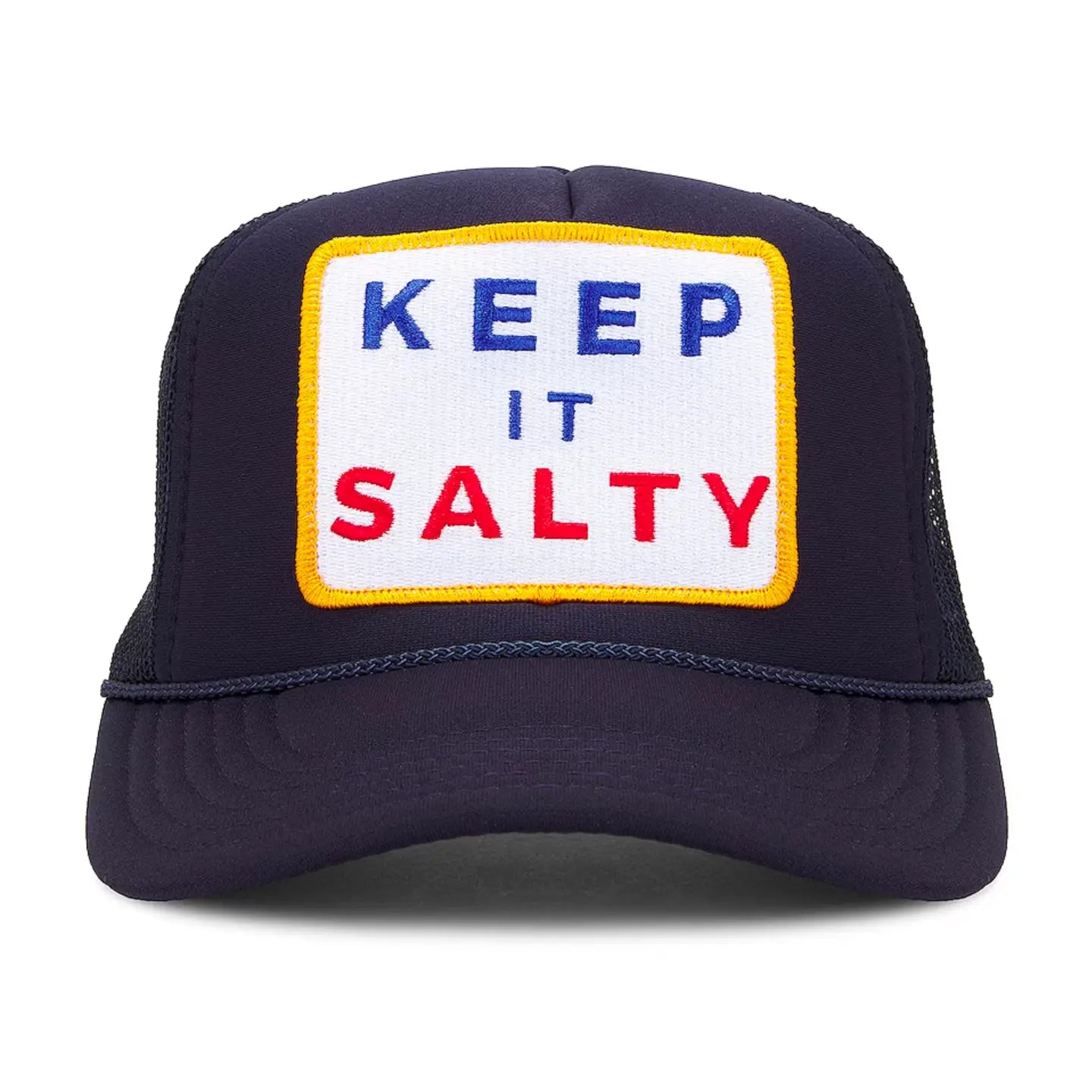 "Keep It Salty" Trucker Hat: A classic navy trucker hat with a playful "Keep It Salty" patch, perfect for sunny days, beach trips, or adding a laid-back vibe to any outfit.